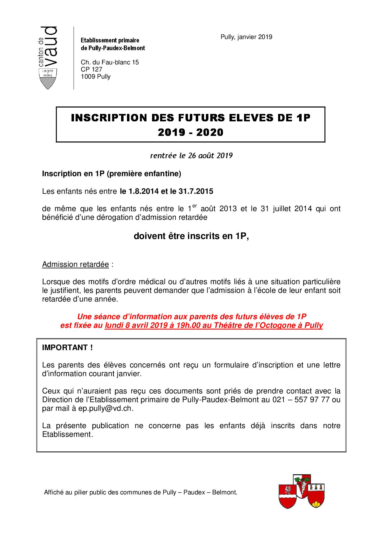 INSCRIPTION DES FUTURS ELEVES DE 1P 2019 - 2020 à télécharger en PDF